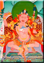 school of Buddhism. At the same time, he is one of the most prominent representatives of the tendency, already begun in Tibet in the seventh century, to merge the regional, nature-based religious cults with Buddhism. Already early on, Guru Rinpoche was portrayed as the Second Buddha. This was already indicated by the myth surrounding the birth . The biography of the Guru is - as one can see in the mural depicted below - analog to the life story of Buddha Shakyamuni shown through twelve deeds. From the central figure of Guru Rinpoche, the golden rays of wisdom go out in all directions. In the inside of his elbow, on the left-hand side, he holds a trident staff with three heads as a secret symbol for his tantric partner (yum). He is flanked by his tantric companions Yeshe Tshogyal,