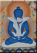 Samantabhadra, the primordial Buddha is pure omniscience, the essence of the enlightened mind of all the Buddhas. He is depicted as a dark-blue nude figure embracing his white consort Samantabhadri, the female primordial Buddha, their union represents the fusion of wisdom and compassion, the ultimate indivisibility of samsara and nirvana and the potential for Buddhahood inherent in all sentient beings.Samanta means, "universally extending." Bhadra means "great virtue." Samantabhadra means to extend such great compassion that every sentient being is benefited and to practice so extensively and profoundly that all virtue is perfected. Samantabhadra is not subject to limits of time, place, or physical conditions. Samantabhadra does not represent a person, but the Buddha-nature itself, the unchanging purity of the mind which is the fundamental nature of all beings. Samantabhadra is not a colored being with two eyes, etc. Samantabhadra is the unity of awareness and emptiness, the unity of appearances and emptiness, the nature of mind, natural clarity with unceasing compassion - that is Samantabhadra from the very beginning. |