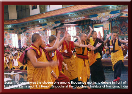 Since his childhood, Sonam Rinpoche had shown his renunciation mind and his outstanding performance in studies. At the age of six, Rinpoche learned the Tibetan language from his father, Yonten Tharshin. At the age of ten, he was robed as a monk at the Adzom Monastery, Sichuan, China
