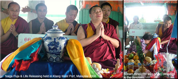 NSCF believes that one of the vital aspect of releasing life in a Buddhist context is to establish a link between the saved being and the Buddha Dharma. While lengthening the life of another being is considered a worthy and compassionate act, it is believed to be much more beneficial when it enables the saved being to make a connection with a path that ultimately will lead it to gaining release from rebirths in the realms of suffering. NSCF jointly held the Naga Puja and Life Releasing event, another auspicious activity conducted by Sonam Rinpoche, on the 28th June 2008, the auspicious Naga day, in the Klang West Port, Malaysia. We had total of 45 dharma participants, including Sonam Rinpoche, Khenpo and 4 lamas. The Naga Puja text that used was the the profound terma (mind treasure) that revealed by the terton, 1st Adzom Drugpa Rinpoche in the 19th century.