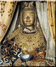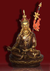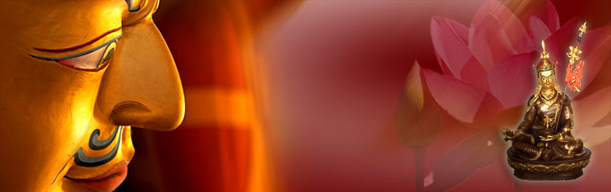 The Buddha Amithaba is said to have taken from the base of his heart a golden vajra and to have sent it into a lotus blossom that was blooming in the Dhanakosa lake in Kashmir. Out of this blossom grew a child, through which Amithaba incarnated himself, in order to spread wisdom and to tame the demons of India and Tibet.