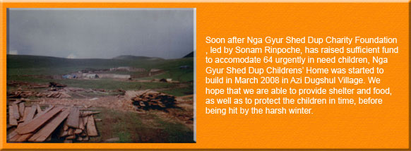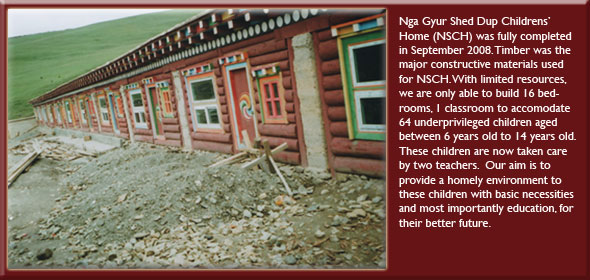 With the blessings of Buddhas and the support from the generous public, we are able to build the first phase of the NSCL in 2008 at Azi Dugshul Village in the Bai Yu County, namely Nga Gyur Shed Dup Childrens’ Home.